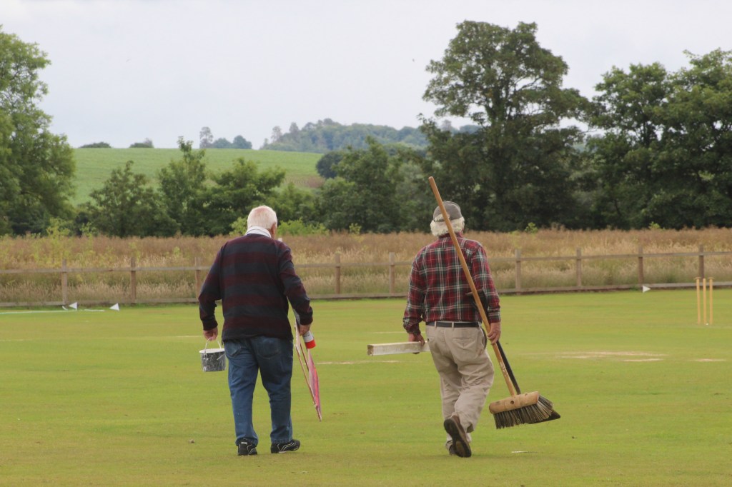 A familiar sight, Hilly (right) & Charlie Andrews (left) ensuring the wicket is ready for the second innings. Hilly (right), with Charlie Andrews (left) & Charles Kislingbury (middle) in the spot he always occupied on Saturdays.
